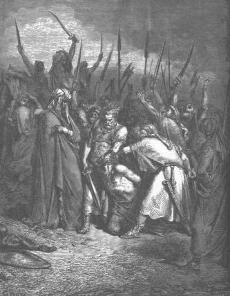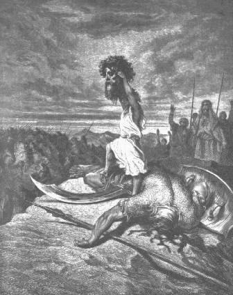 S 17:41 Y el Filisteo venía andando y acercándose a David, y su escudero delante de él. 1 S 17:42 Y como el Filisteo miró y vió a David túvole en poco; porque era mancebo, y rubio, y de hermoso parecer. 1 S 17:43 Y dijo el Filisteo a David: ¿Soy yo perro para que vengas a mí con palos? Y maldijo a David por sus dioses. 1 S 17:44 Dijo luego el Filisteo a David: Ven a mí, y daré tu carne a las aves del cielo, y a las bestias del campo. 1 S 17:45 Entonces dijo David al Filisteo: Tú vienes a mí con espada y lanza y escudo; mas yo vengo a ti en el nombre de Jehová de los ejércitos, el Dios de los escuadrones de Israel, que tú has provocado. 1 S 17:46 Jehová te entregará hoy en mi mano, y yo te venceré, y quitaré tu cabeza de ti: y daré hoy los cuerpos de los Filisteos a las aves del cielo y a las bestias de la tierra: y sabrá la tierra toda que hay Dios en Israel. 1 S 17:47 Y sabrá toda esta congregación que Jehová no salva con espada y lanza; porque de Jehová es la guerra, y él os entregará en nuestras manos. 1 S 17:48 Y aconteció que, como el Filisteo se levantó para ir y llegarse contra David, David se dió priesa, y corrió al combate contra el Filisteo. 1 S 17:49 Y metiendo David su mano en el saco, tomó de allí una piedra, y tirósela con la honda, e hirió al Filisteo en la frente: y la piedra quedó hincada en la frente, y cayó en tierra sobre su rostro. 1 S 17:50 Así venció David al Filisteo con honda y piedra; e hirió al Filisteo y matólo, sin tener David espada en su mano. 1 S 17:51 Mas corrió David y púsose sobre el Filisteo, y tomando la espada de él, sacándola de su vaina, matólo, y cortóle con ella la cabeza. Y como los Filisteos vieron su gigante muerto, huyeron. 1