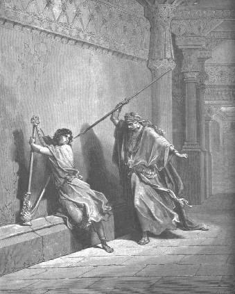 S 18:10 Otro día aconteció que el espíritu malo de parte de Dios tomó a Saúl, y mostrábase en su casa con trasportes de profeta: y David tañía con su mano como los otros días; y estaba una lanza a mano de Saúl. 1 S 18:11 Y arrojó Saúl la lanza, diciendo: Enclavaré a David en la pared. Y dos veces se apartó de él David.