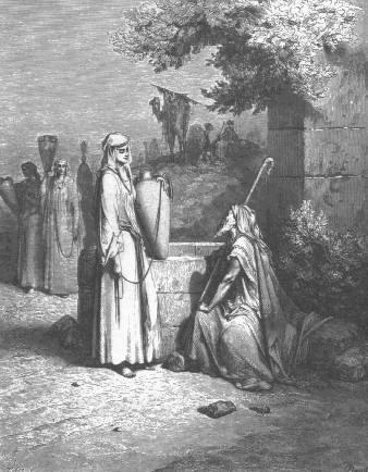 24:10 Y el criado tomó diez camellos de los camellos de su señor, y fuése, pues tenía a su disposición todos los bienes de su señor: y puesto en camino, llegó a Mesopotamia, a la ciudad de Nachôr. Gn 24:11 E hizo arrodillar los camellos fuera de la ciudad, junto a un pozo de agua, a la hora de la tarde, a la hora en que salen las mozas por agua. Gn 24:12 Y dijo: Jehová, Dios de mi señor Abraham, dame, te ruego, el tener hoy buen encuentro, y haz misericordia con mi señor Abraham. Gn 24:13 He aquí yo estoy junto a la fuente de agua, y las hijas de los varones de esta ciudad salen por agua: Gn 24:14 Sea, pues, que la moza a quien yo dijere: Baja tu cántaro, te ruego, para que yo beba; y ella respondiere: Bebe, y también daré de beber a tus camellos: que sea ésta la que tú has destinado para tu siervo Isaac; y en esto conoceré que habrás hecho misericordia con mi señor. Gn 24:15 Y aconteció que antes que él acabase de hablar, he aquí Rebeca, que había nacido a Bethuel, hijo de Milca, mujer de Nachôr hermano de Abraham, la cual salía con su cántaro sobre su hombro. Gn 24:16 Y la moza era de muy hermoso aspecto, virgen, a la que varón no había conocido; la cual descendió a la fuente, y llenó su cántaro, y se volvía. Gn 24:17 Entonces el criado corrió hacia ella, y dijo: Ruégote que me des a beber un poco de agua de tu cántaro. Gn 24:18 Y ella respondió: Bebe, señor mío: y dióse prisa a bajar su cántaro sobre su mano, y le dió a beber. Gn 24:19 Y cuando acabó de darle a beber, dijo: También para tus camellos sacaré agua, hasta que acaben de beber. Gn 24:20 Y dióse prisa, y vació su cántaro en la pila, y corrió otra vez al pozo para sacar agua, y sacó para todos sus camellos. GÉNESIS