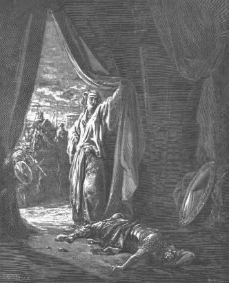 4:17 Y Sísara se acogió a pie a la tienda de Jael mujer de Heber Cineo; porque había paz entre Jabín rey de Asor y la casa de Heber Cineo. Jue 4:18 Y saliendo Jael a recibir a Sísara, díjole: Ven, señor mío, ven a mi, no tengas temor. Y él vino a ella a la tienda, y ella le cubrió con una manta. Jue 4:19 Y él le dijo: Ruégote me des a beber una poca de agua, que tengo sed. Y ella abrió un odre de leche y dióle de beber, y tornóle a cubrir. Jue 4:20 Y él le dijo: Estáte a la puerta de la tienda, y si alguien viniere, y te preguntare, diciendo: ¿Hay aquí alguno? Tú responderás que no. Jue 4:21 Y Jael, mujer de Heber, tomó una estaca de la tienda, y poniendo un mazo en su mano, vino a él calladamente, y metióle la estaca por las sienes, y enclavólo en la tierra, pues él estaba cargado de sueño y cansado; y así murió. Jue 4:22 Y siguiendo Barac a Sísara, Jael salió a recibirlo, y díjole: Ven, y te mostraré al varón que tú buscas. Y él entró donde ella estaba, y he aquí Sísara yacía muerto con la estaca por la sien. Jue 4:23 Así abatió Dios aquel día a Jabín, rey de Canaán, delante de los hijos de Israel. JUECES