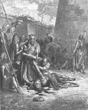 9:50 Después Abimelech se fue a Thebes; y puso cerco a Thebes, y tomóla. Jue 9:51 En medio de aquella ciudad había una torre fuerte, a la cual se retiraron todos los hombres y mujeres, y todos los señores de la ciudad; y cerrando tras sí las puertas, subiéronse al piso alto de la torre. Jue 9:52 Y vino Abimelech a la torre, y combatiéndola, llegóse a la puerta de la torre para pegarle fuego. Jue 9:53 Mas una mujer dejó caer un pedazo de una rueda de molino sobre la cabeza de Abimelech, y quebróle los cascos. Jue 9:54 Y luego llamó él a su escudero, y díjole: Saca tu espada y mátame, porque no se diga de mí: Una mujer lo mató. Y su escudero le atravesó, y murió. Jue 9:55 Y como los Israelitas vieron muerto a Abimelech, fuéronse cada uno a su casa. Jue 9:56 Así pues pagó Dios a Abimelech el mal que hizo contra su padre matando a sus setenta hermanos. Jue 9:57 Y aun todo el mal de los hombres de Sichêm tornó Dios sobre sus cabezas: y la maldición de Jotham, hijo de Jerobaal, vino sobre ellos. JUECES