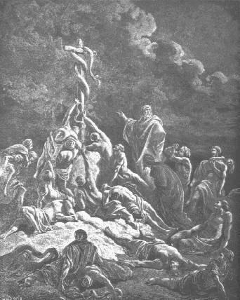 21:4 Y partieron del monte de Hor, camino del mar Bermejo, para rodear la tierra de Edom; y abatióse el ánimo del pueblo por el camino. Nm 21:5 Y habló el pueblo contra Dios y Moisés: ¿Por qué nos hiciste subir de Egipto para que muramos en este desierto? que ni hay pan, ni agua, y nuestra alma tiene fastidio de este pan tan liviano. Nm 21:6 Y Jehová envió entre el pueblo serpientes ardientes, que mordían al pueblo: y murió mucho pueblo de Israel. Nm 21:7 Entonces el pueblo vino a Moisés, y dijeron: Pecado hemos por haber hablado contra Jehová, y contra ti: ruega a Jehová que quite de nosotros estas serpientes. Y Moisés oró por el pueblo. Nm 21:8 Y Jehová dijo a Moisés: Hazte una serpiente ardiente, y ponla sobre la bandera: y será que cualquiera que fuere mordido y mirare a ella, vivirá. Nm 21:9 Y Moisés hizo una serpiente de metal, y púsola sobre la bandera, y fue, que cuando alguna serpiente mordía a alguno, miraba a la serpiente de metal, y vivía. NÚMEROS